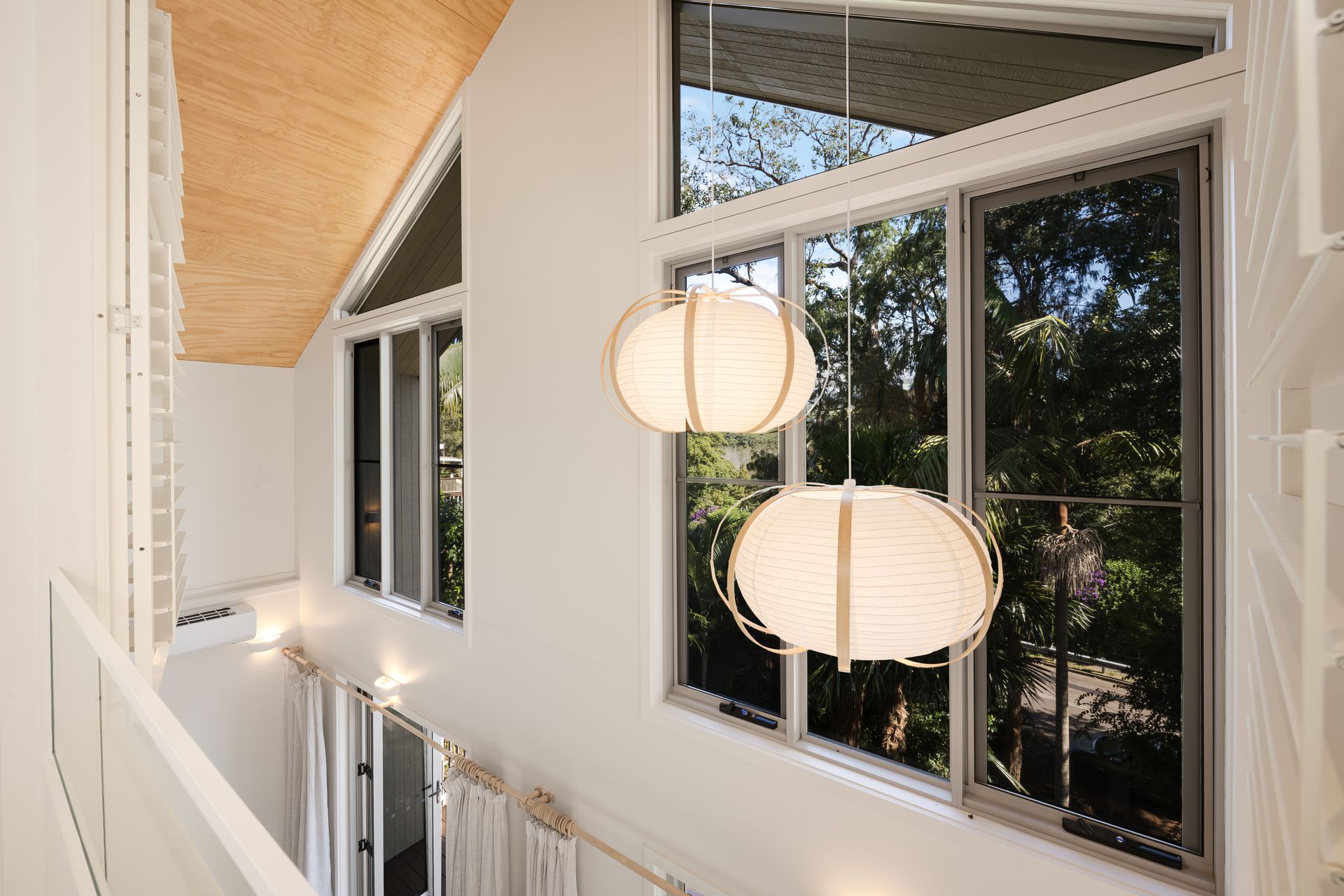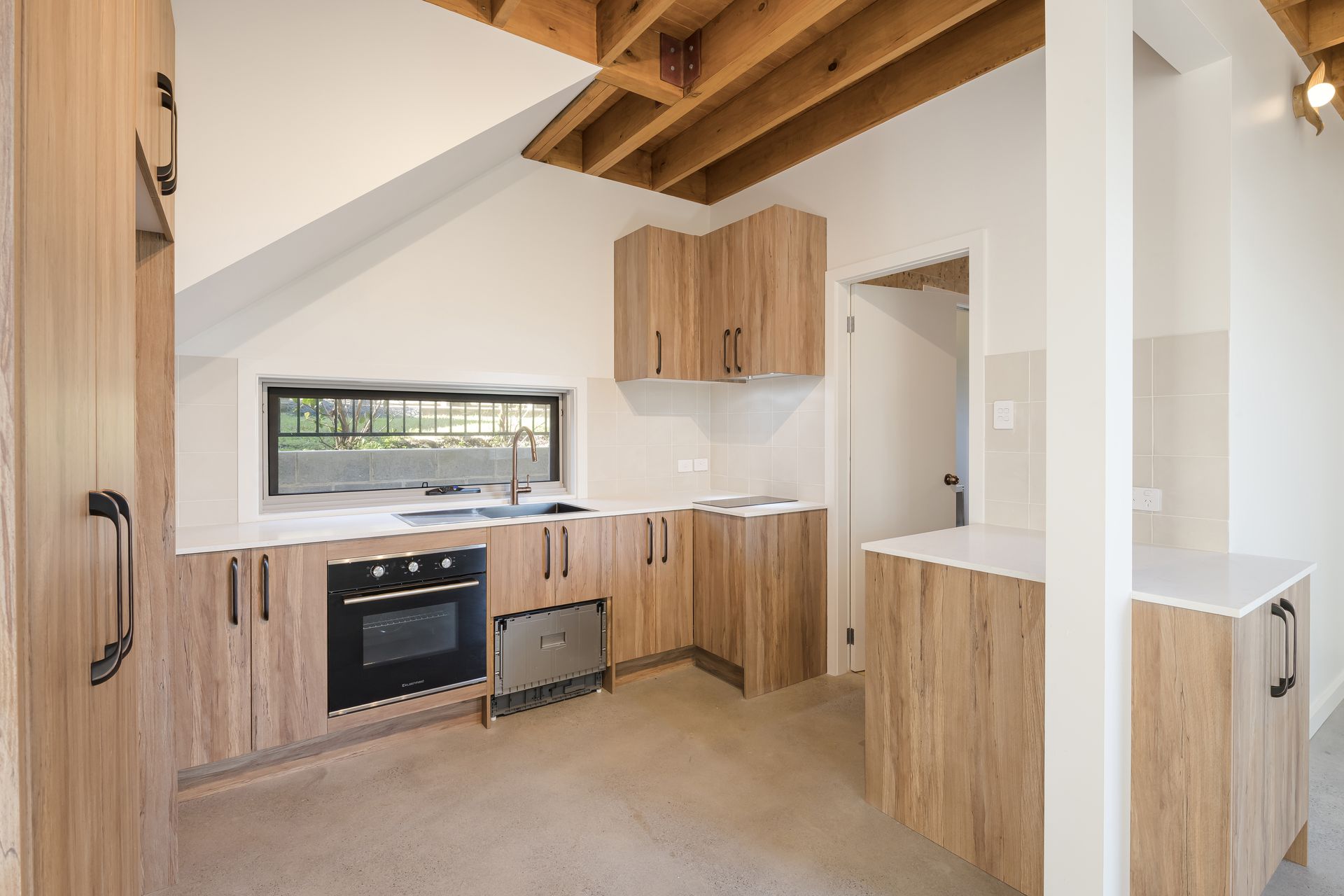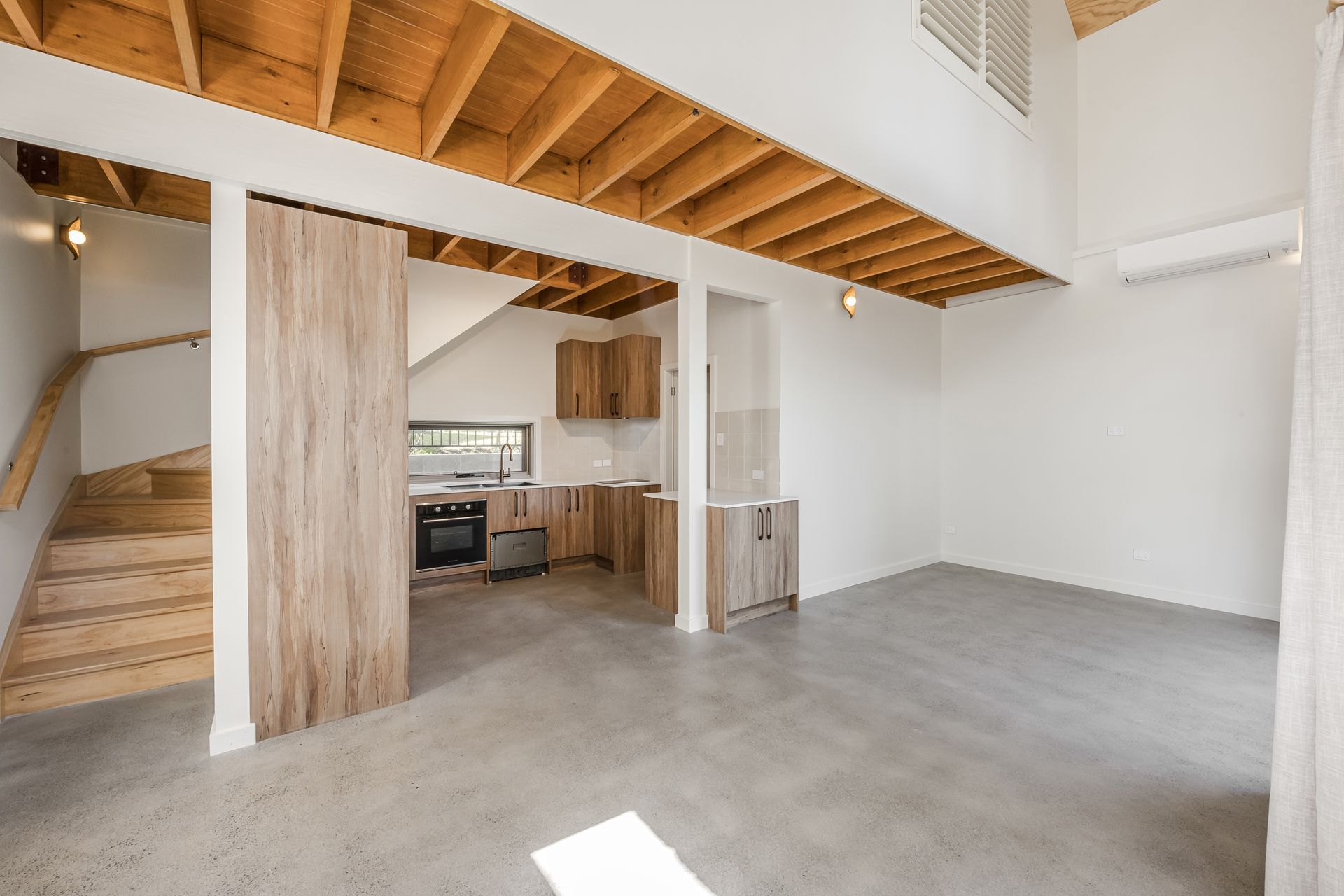 • Soaring double-height living room with raked ceiling, timber beams, natural light