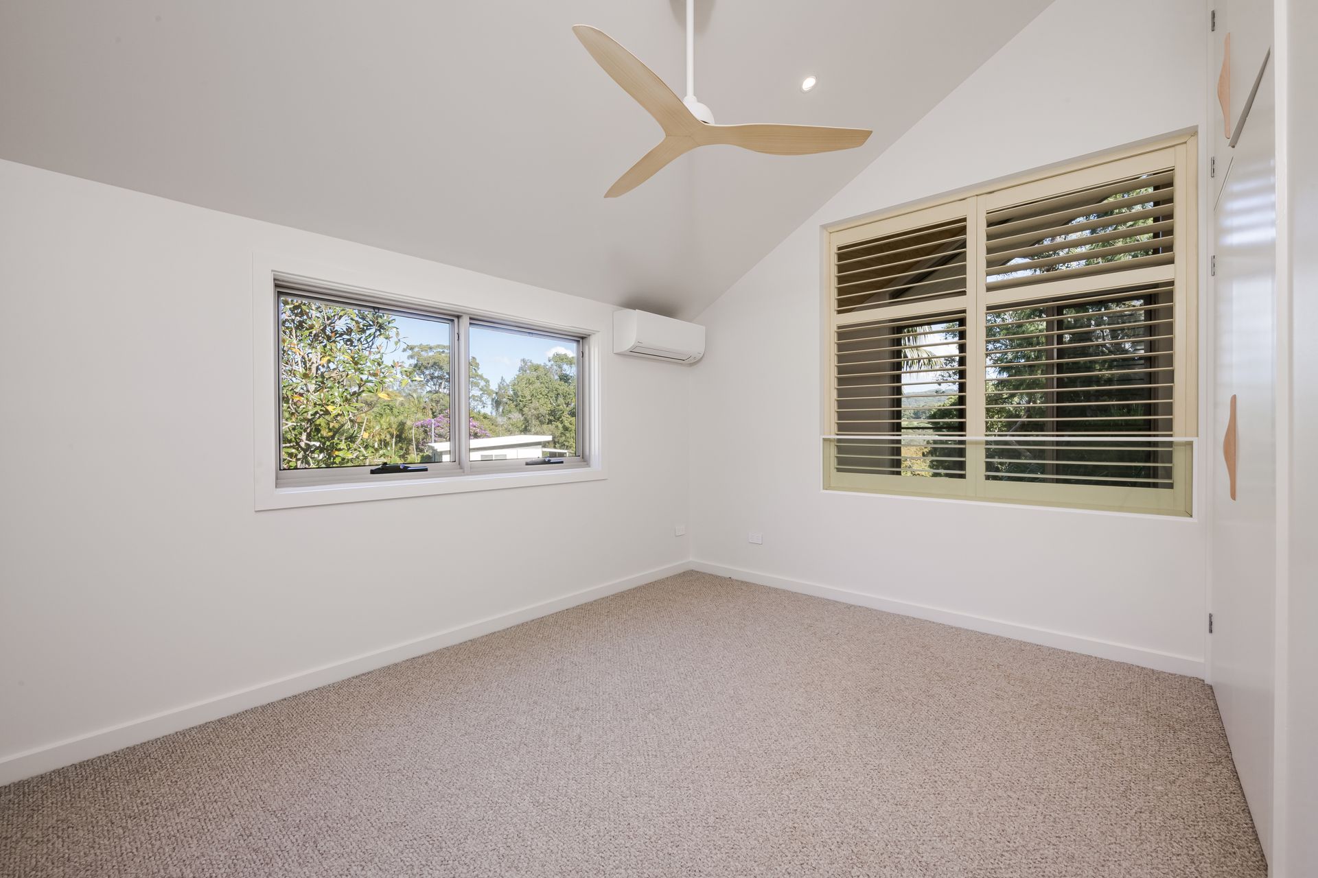 • Two mezzanine-level bedrooms with raked ceilings, built-in robes & plantation shutters